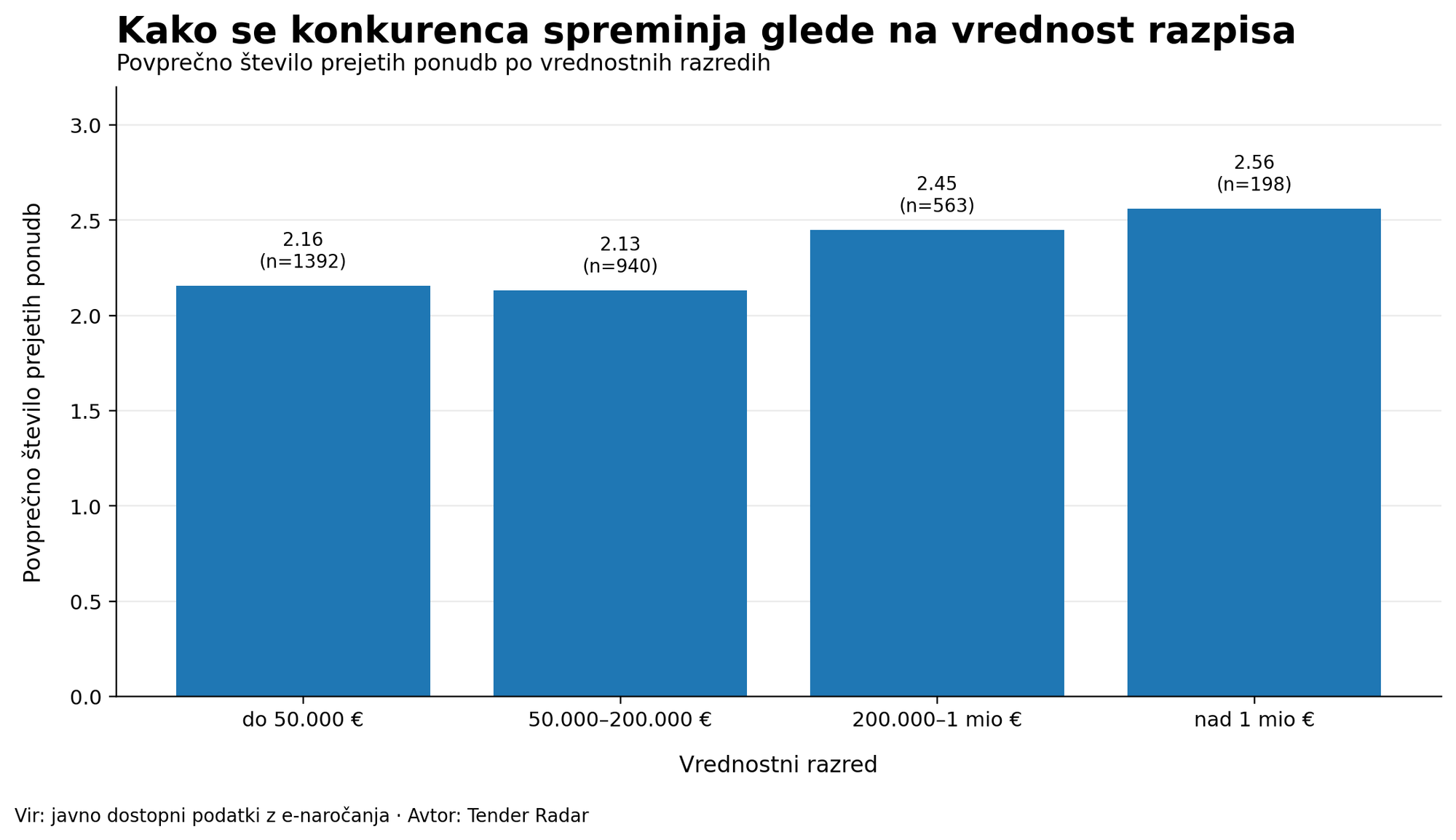 Pri razpisih do 50.000 € je bilo povprečno število prejetih ponudb 2,15. V razponu med 50.000 € in 200.000 € je bilo povprečje enako. Pri razpisih med 200.000 € in 1 milijonom € je povprečje zraslo na 2,44, pri razpisih nad 1 milijon € pa na 2,55.